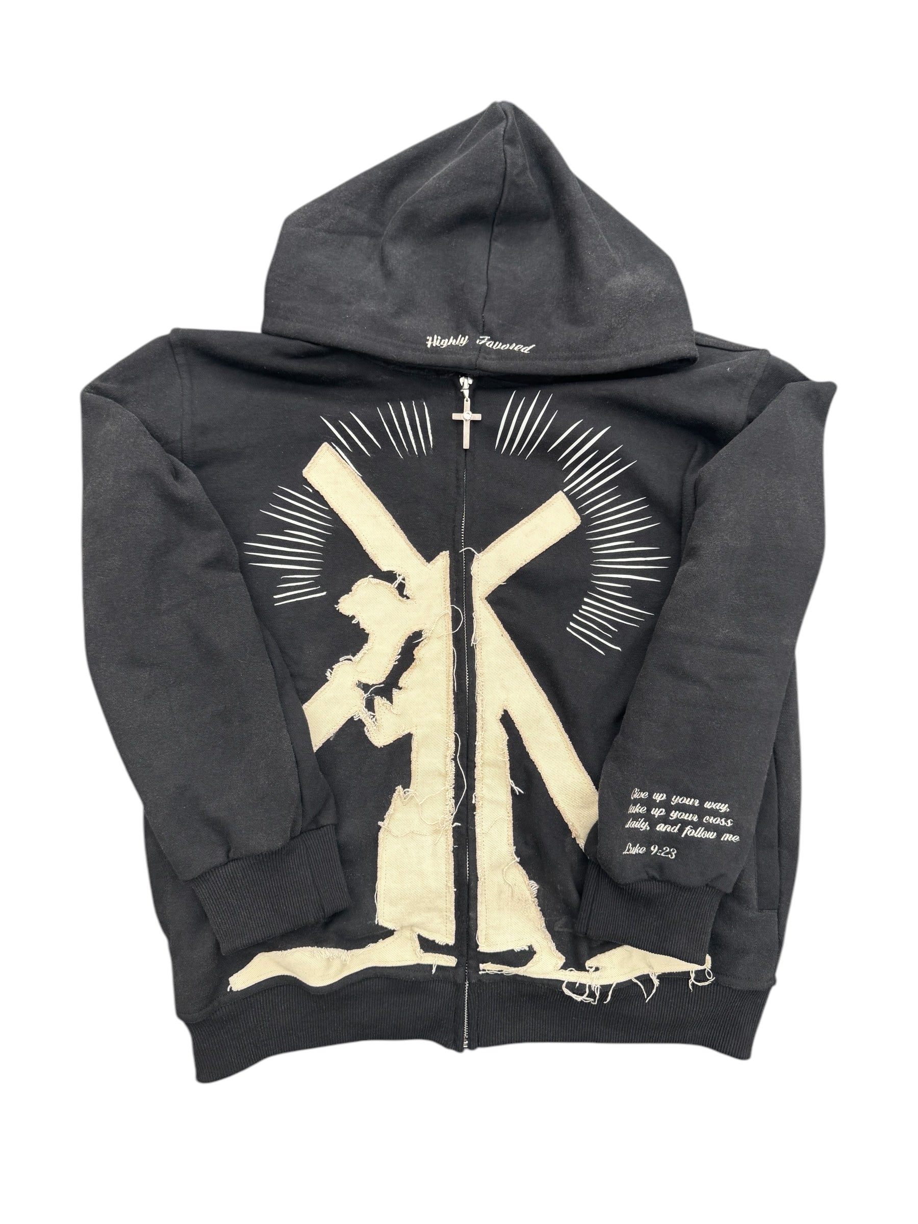 Featuring a powerful image of Jesus carrying the cross and the verse reference on the left sleeve, this hoodie serves as a reminder to walk the path of daily sacrifice and devotion. Made from premium, soft fabric for comfort and durability, this hoodie is perfect for anyone who desires to share their faith while making a statement.